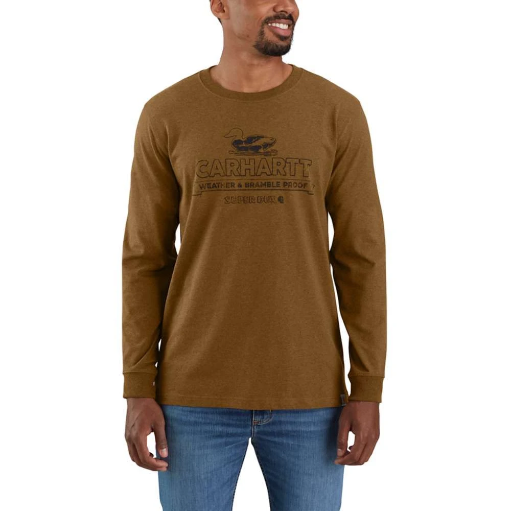 Stay at ease throughout the day in a Carhartt Super Dux T-shirt. Designed for modern men, this long-sleeved oiled walnut T-shirt is made from cotton and polyester. It has a rib knit neckline and cuffs with a relaxed fit. The graphic print and Carhartt label at the front add a stylish edge.