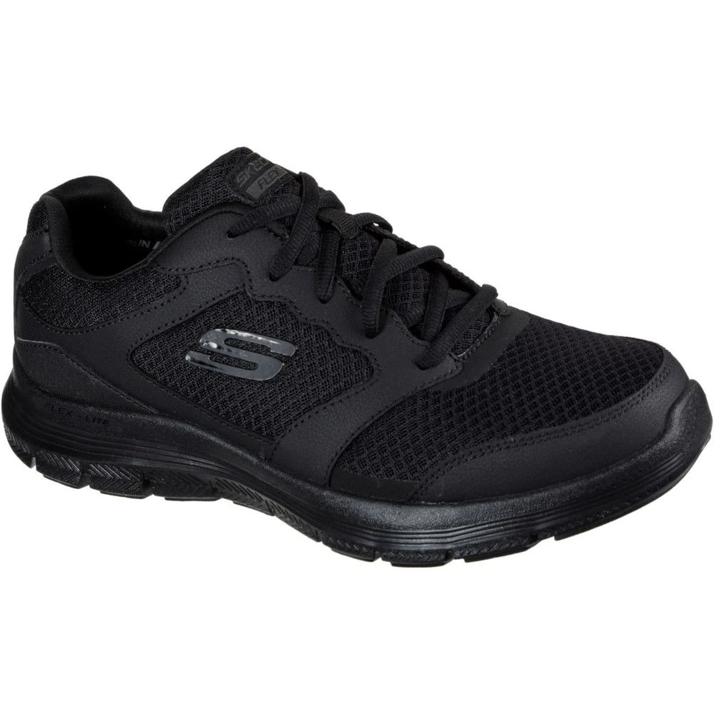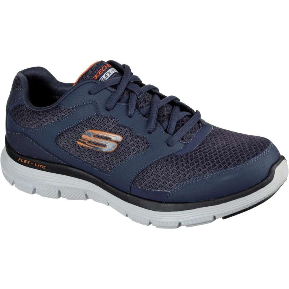 Seek comfort with every step you take by wearing the Skechers Men’s Flex Advantage 3.0 Sports Trainers. These sports trainers are designed with a smooth action leather upper and diamond-textured mesh fabric panels that promote breathability. For an enhanced visual appeal, these trainers have smooth leather overlays at toe, laces, and heel. With the heel panel fabric overlay and pull-on tab loop at the top, you can wear these trainers comfortably. They have a lace up front, padded collar, tongue and soft fabric shoe lining. The Air-Cooled Foam cushioned comfort insole helps in reducing pain and the lightweight flexible shock-absorbent midsole provides great comfort.Â